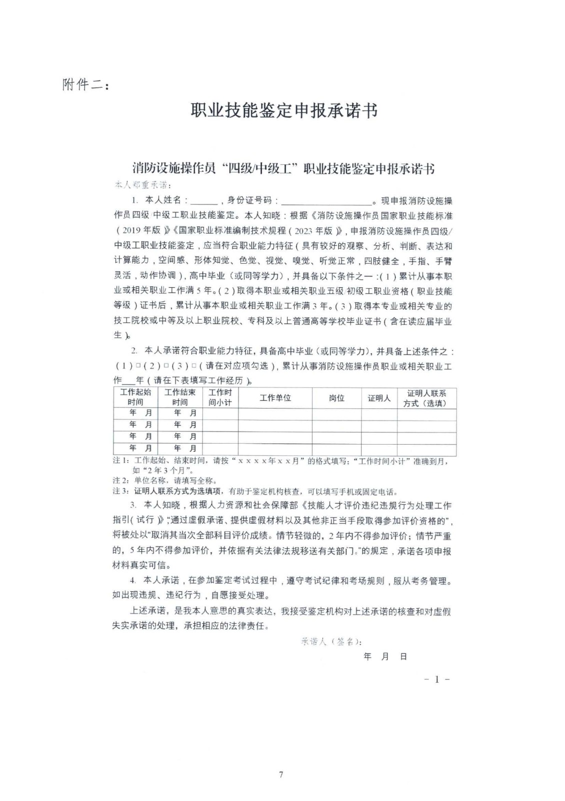 消防设施操作员“四级中级工”职业技能鉴定申报承诺书.docx