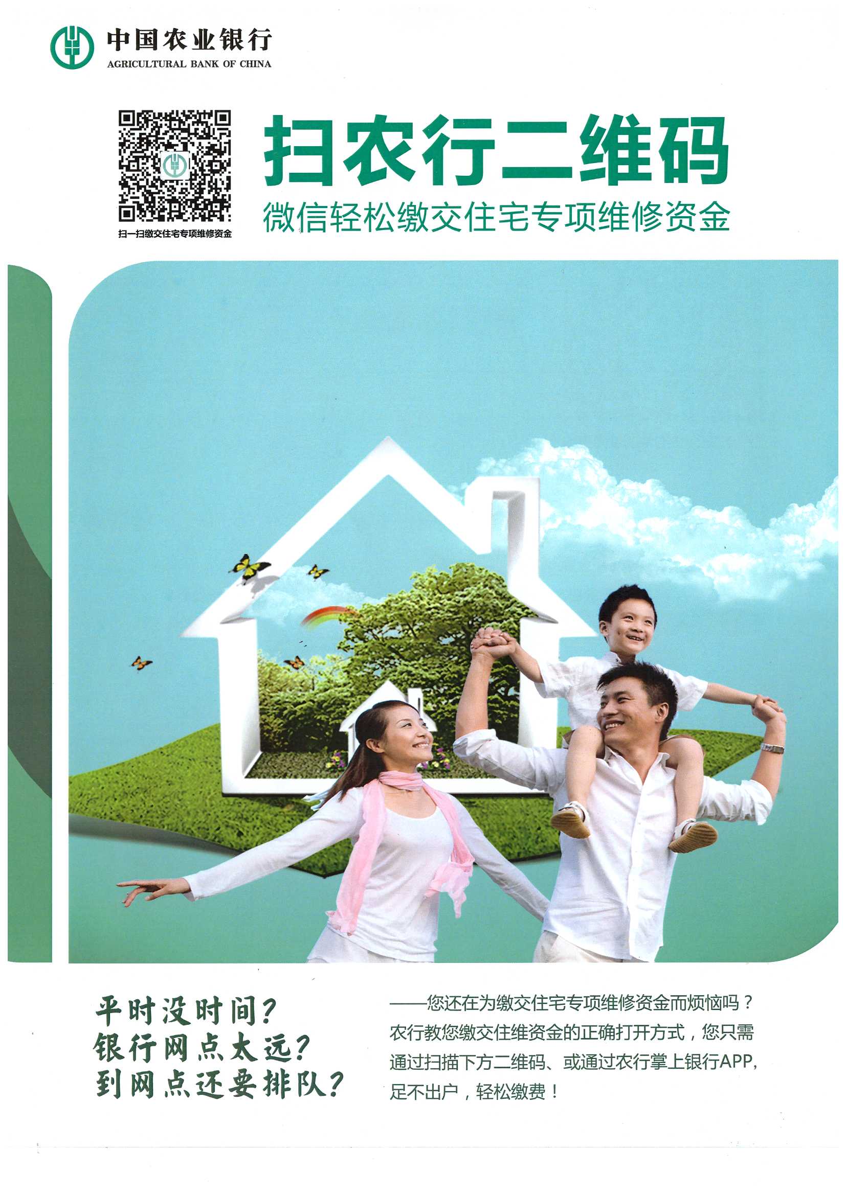 为做好住维资金缴存工作,加快推进缴交进度,促进互联网金融服务民生,方便广大业主缴存住维资金,中国农业银行股份有限公司进一步完善住维资金缴存渠道,拓展网络金融应用领域,于2018年5月4日全国率先上线扫描二维码缴存住维资金系统,即通过微信、支付宝、掌银等支付方式便可轻松缴纳住维资金。